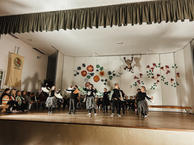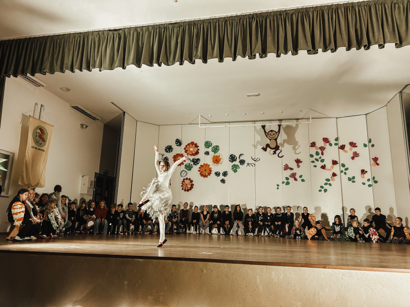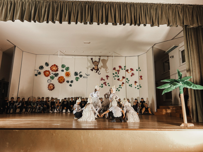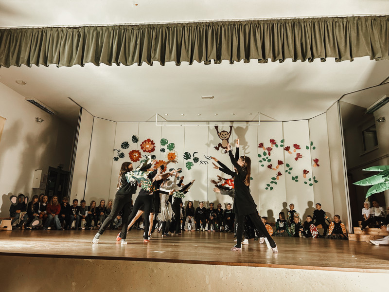 V prazničnem decembru so učenci od 1. do 5. razreda pripravili čudovito predstavo »Kakadujeva novoletna pustolovščina«, v kateri je mali kakadu na svoji poti srečal papige, leoparda, prehlajenega slona in laboda. Vsaka žival mu je podarila pomembno sporočilo o pogumu, prijaznosti, sprejemanju in prijateljstvu.