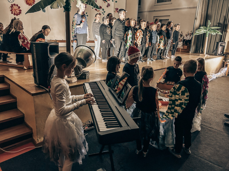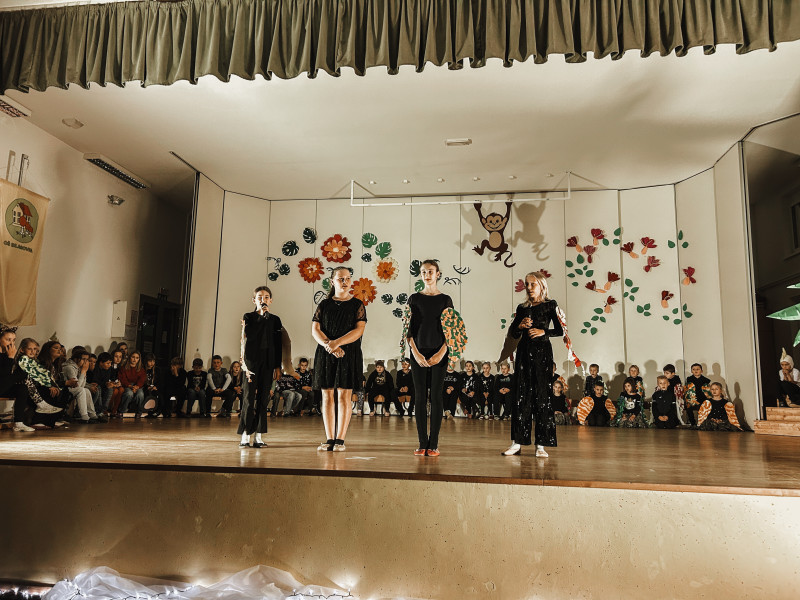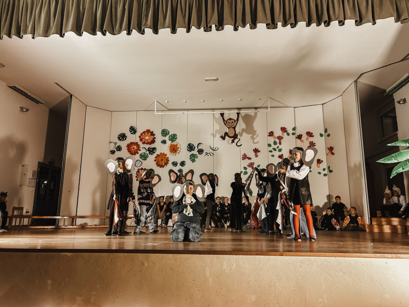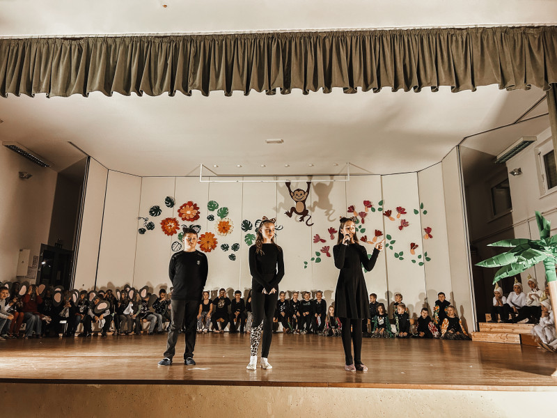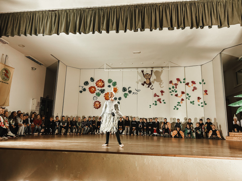 V prazničnem decembru so učenci od 1. do 5. razreda pripravili čudovito predstavo »Kakadujeva novoletna pustolovščina«, v kateri je mali kakadu na svoji poti srečal papige, leoparda, prehlajenega slona in laboda. Vsaka žival mu je podarila pomembno sporočilo o pogumu, prijaznosti, sprejemanju in prijateljstvu.