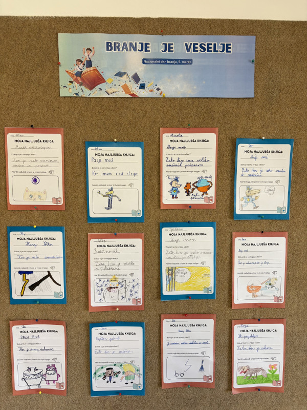 Danes, 5. marca, smo praznovali prvi nacionalni dan branja. Letošnji slogan se glasi: “Branje je veselje”. Kdor najde v branju veselje, zlahka najde tudi knjige, ki ga nagovorijo. Tudi naši učenci na podružnici so našli knjige, ki so jim všeč ter z različnimi dejavnostmi in minutami branja obeležili ta pomemben dan. Skupaj smo brali, se pogovarjali o prebranem in drug drugemu predstavili najljubše knjige. Ugotovili smo, da nas branje lahko popelje v različne domišljijske svetove in nam polepša vsakdan.